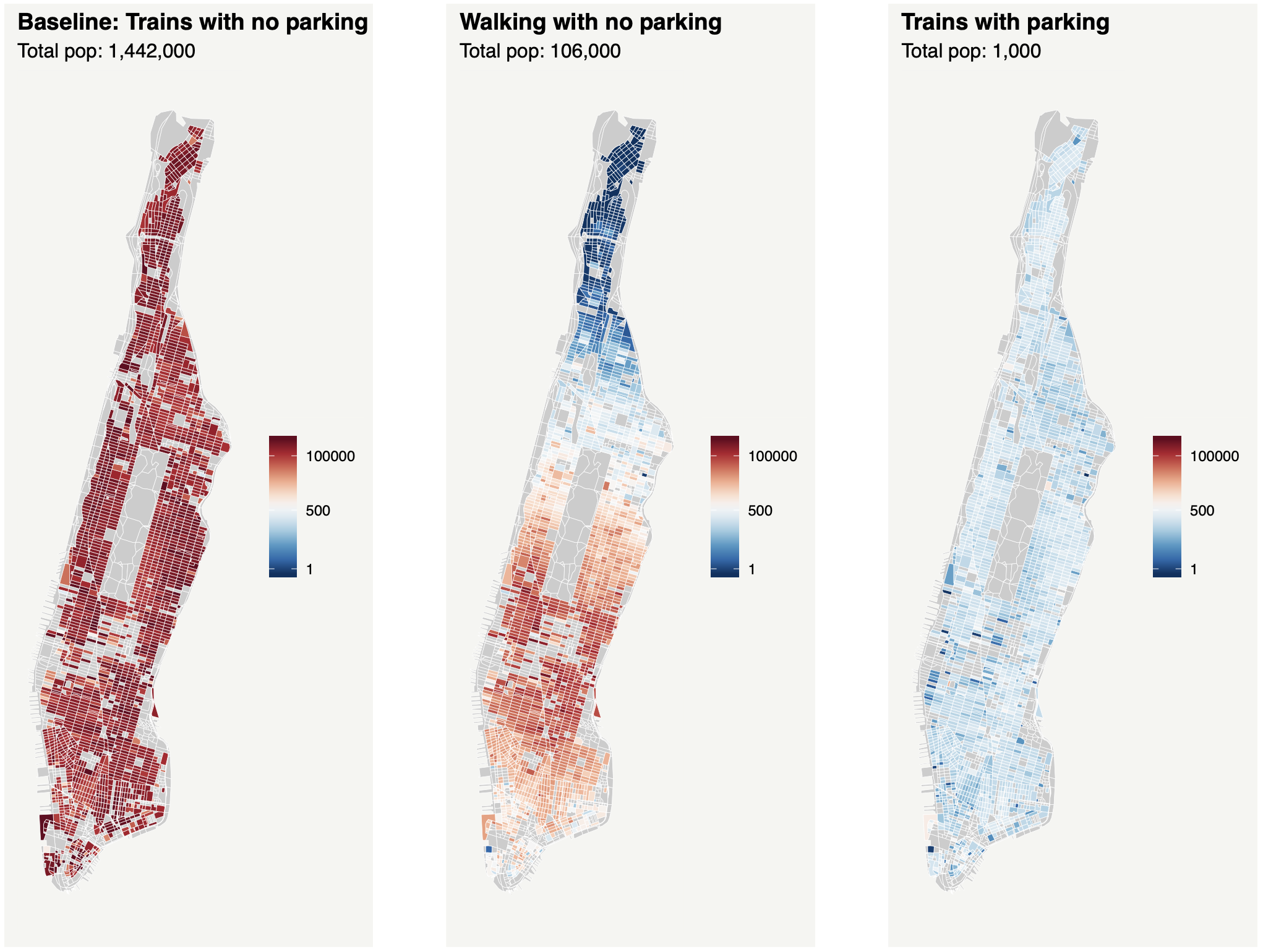 Car-based transportation networks (as in Phoenix) necessitate parking at origin and destination in order to establish a link—but the space devoted to parking lowers its ability to provide housing and consumer amenities. Walking and transit networks (as in Manhattan) have no such tradeoff, and a city reliant on them will be able to make fuller use of its land for productive purposes like amenities and housing. However, they hinder mobility in other ways: walking does not get you far, and using transit requires adhering to the routes and stops the city’s transit agency provides. In this paper, we develop and calibrate a spatial consumer city model to study what would happen if Phoenix banned cars, delineating the roles of parking conversion, of the light rail network, and of a last mile option. Together with a last mile option, Phoenix’s current light rail line would be able to sustain a meaningful (if smaller) population—but only if Phoenix converts its current parking to other uses. We then ask the reverse: what would happen if Manhattan required parking? The model indicates the island would essentially empty, as the declining capacity of each block lowers the vibrancy of the city, inducing still more residents to leave. Altogether, these model outcomes tell a story of agglomeration through complementarities. The transportation network and incumbent land use must ensure a high degree of access to jobs and amenities in order for enough people to choose to live in the city and thereby support those amenities.